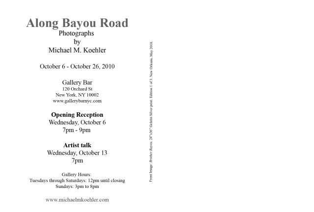 After the BP oil spill disaster in the Gulf of Mexico this summer, Koehler headed back down to the Big Easy and its environs to document the devastation that was taking place and the people it was affecting. A long time coming, Koehler’s documentary project, “Along Bayou Road,” will finally show his work, today starting at 7PM EST – 9PM EST at Gallery Bar, in the Lower East Side.